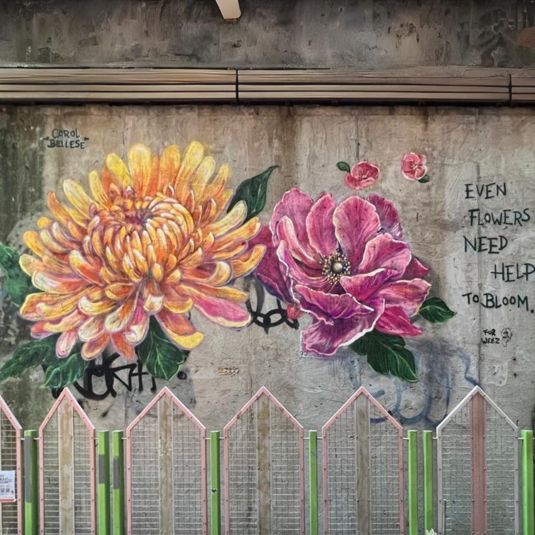 ‘Blooms for the Mind’ is an uplifting mural meant to bring a moment of joy to passers-by while raising awareness about mental health. Carol, the artist who created the piece, has personally witnessed the challenges of finding mental health support in Hong Kong for people in need of help, and this mural is her effort to open a conversation about this important societal issue. Studies have shown that being around flowers can reduce stress levels in people, particularly chrysanthemums and anemones (the largest flowers depicted in the mural), which can be used medicinally to help with anxiety. The intention of the words “Even flowers need help to bloom,” is to encourage viewers to reflect on the idea that we cannot thrive in solitude. It is natural to need help and support at times - we should not be afraid to ask for it, and we should offer it whenever we can. Be kind.