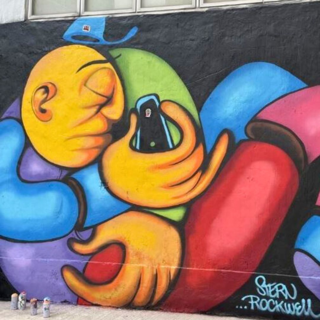 This striking mural captures an individual weathering personal struggles, with cellphone in his hand, recognising the need to connect and reach out for help. The hugging pose is a gesture of self-care and acceptance.